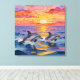 An ai impasto style dolphins swimming with a pink, orange and purple sunset over the ocean . A beautiful coastal wall art piece for your beach home or beachy styled home.