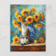 Ein beeindruckendes Ölgemälde einer Katze, die vor einem großen Sonnenblumenstrauß auf einem Tisch sitzt. Eine lebendige und ruhige Szene, die felinen Charme und blühende Schönheit verbindet.