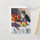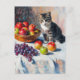 Ein beeindruckendes Ölgemälde mit einer kleinen Katze, die auf einem Tisch mit einer Schüssel Äpfel und Trauben sitzt. Eine lebendige und künstlerische Verschmelzung von felinem Charme und Stillleben.