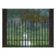 Eine 3D-Landschaft im Frühherbst, die einen Weg darstellt, der durch das Gras wandert, in einen miessigen Wald mit alten und gegrabenen Bäumen. Aber der überwucherte Weg wird durch ein Tor von schwarzen Eisenstangen zwischen dunklen Ziegelmauern versperrt. Erstellt in Vue.