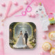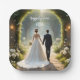 Ein malerischer Spaziergang durch eine weiße Rosenhecke, eine Braut und ein Spaziergang durch einen grünen Fern-Bogengang in einen zauberhaften, bezaubernden Wald.