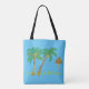 Mosaik, grafischer zeichn, einer Insel mit zwei Kokospalmen und Hütte, in den Farben Grün, Gelb, Türkis, Blau, Taupe, Braun und Schwarz mit dem Satz "Summering In the Tropics" dargestellt.