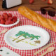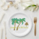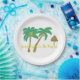 Mosaik, grafischer zeichn, einer Insel mit zwei Kokospalmen und Hütte, in den Farben Grün, Gelb, Türkis, Blau, Taupe, Braun und Schwarz mit dem Satz "Summering In the Tropics" dargestellt.