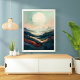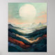 Dieses ätherische Landschaftsbild besticht durch seine sanften Farbtöne, sanften Hügel und die abgelegenen Berge. Die große weiße Sonne verleiht der Szene eine Touch von Wärme und Gelassenheit. Dieses Kunstwerk eignet sich hervorragend, um eine friedliche und beruhigende Atmosphäre in jedem Raum zu schaffen.