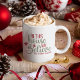 Feiern Sie den Urlaub mit dieser niedlichen personalisierten Kaffee-Tasse, die die Worte "In diesem Haus glauben wir" in Retro Weihnachtsfarben von Rot und Grün und eine niedliche Weihnachtsmannmütze und Sternexplosion Detail. Fügen Sie Ihren Familiennamen oder persönlichen Text hinzu, um diese Tasse einzigartig zu machen.