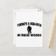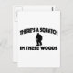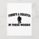 Das berüchtigte lustige Zitat "There's A Squatch In This Woods" mit dem verkürzten Bigfoot Spitznamen, alles in einer einfachen schwarzen Schrift mit einer Sasquatch-Silhouette zwischen den Phrasen.