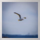 A seagull gracefully soars through a clear blue sky, its wings spread wide. The horizon is faintly visible in the background, adding depth to the open atmosphere.