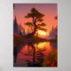 Ein majestätischer Baum, in einem anmutigen Bogen gebeugt, steht stolz am friedlichen Fluss. Die ganze Landschaft ist in einem warmen Licht eines orangefarbenen Sonnenuntergangs gebadet und schafft ein atemberaubendes Tableau der Ruhe und Schönheit, das das Wesen der Ruhe der Natur erahnen lässt.