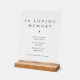 Ehren Sie die geliebten Menschen, die für immer in Ihrem Herzen sind, mit diesem eleganten schwarzen und weißen Hochzeitstisch-Akryschild zur Erinnerung. Mit einem modernen, minimalistischen Design versehen, fügt dieses "In liebevoller Erinnerung"-Schild Ihrer Hochzeitserinnerungstisch eine bedeutungsvolle und herzliche Note hinzu. Anpassbar mit den Namen Ihrer verstorbenen geliebten Menschen.