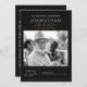 Dieses moderne Begräbnisprogramm besticht durch ein sauberes, minimalistisches Layout mit schwarzem Hintergrund, eleganten Serif-Schriftart und handgeschriebenen, goldfarbenen Schriftzeichen-Akzenten für einen zeitlosen und respektvollen Look. Ein großes Foto wird neben personalisierten Gedenkstätten gezeigt, das dem Service einen herzlichen Charakter verleiht. Auf der Rückseite bietet das Layout Platz für die Reihenfolge der Dienste, sodass es einfach ist, eine aussagekräftige und gut strukturierte Hommage zu schaffen. Dieses geschmackvolle und zeitgenössische Design bietet eine schöne Möglichkeit, das Leben eines geliebten Menschen mit Anmut und Würde zu feiern.
