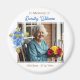 A photo magnet memorial keepsake for funerals, celebration of life gatherings or to send to friends and family in honor of someone they lost. You can add a photo in the personalized area. The accent colors used are blue and gold. There is a gold cross with blue flowers on it.