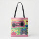 Eine niedliche und einzigartige Cartoon Girl Cat Malerei 180 oder zwischen lustigen bunten Boombox I Liebe mein Zimmer Kätzchen Volkskunst Stil Vintage ästhetische Spaß Blinkback Nostalgie ganz in den 80er Jahren epische Illustration Deluxe Spaß niedlichen Allround-Stil oder Crossbody Tote-Tasche. Holen Sie sich heute eine Tasche im epischen Cartoon-Stil.