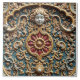 A highly detailed relief sculpture features a symmetrical arrangement of ornate, baroque-style elements. At the top center, a pale-skinned, fair-haired woman with her eyes closed is integrated into the design. Below her, a circular motif with a red interior and a golden sunburst pattern adds a focal point.