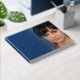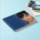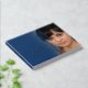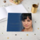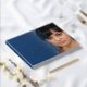Ein Grabmal-Gedenkbuch. Ein einfaches Design in unseren Herzen für immer typografisches Herz-Script-Logo-Design in Silberfolie auf Mittelblau fügen Ihr eigenes Foto, Namen und Daten hinzu. Originelles Design von www.mylittleeden.com