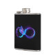 Glühendes, lila Unendlichkeitssymbol mit fliegendem, leuchtendem, blauen Kolibri auf schwarzem Hintergrund. Neon.