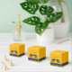 Diese individuell gestalteten Gefälligkeitsboxen bieten einen modernen Touch auf traditionelle indische Hochzeitszeremonien und Empfang mit einer kühnen Farbpalette aus goldgelb und königsblau. Die Boxen sind mit einem geometrischen Motiv versehen und zeigen Abbildungen von Elefanten in königsblau.