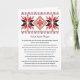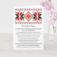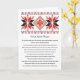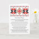 Die Vorderseite dieser Karte hat eine bestickte Grenze von roten und schwarzen Sternen und braunen Diamanten, und das Native American Great Spirit Gebet (übersetzt von Lakota Sioux Chief Yellow Lark 1887): Oh, Großer Geist, dessen Stimme ich im Wind höre, dessen Atem der ganzen Welt Leben gibt. Hören Sie mich; Ich brauche deine Stärke und Weisheit. Lass mir, in Schönheit zu gehen, und lass meine Augen immer den lila und roten Sonnenuntergang sehen. Machen Sie meine Hände respektieren die Dinge, die Sie gemacht haben und meine Ohren scharf zu hören Ihre Stimme. Machen Sie mich weise, damit ich verstehen kann, was Sie meinem Volk beigebracht haben. Hilf mir, ruhig und stark zu bleiben, angesichts all dessen, was auf mich zukommt. Lass mir die Lektionen, die du in jedem Blatt und Felsen versteckt hast, zu lernen. Hilf mir, reine Gedanken zu suchen und mit der Absicht zu handeln, anderen zu helfen. Hilf mir, Mitgefühl zu finden, ohne mich zu überwältigen. Ich strebe Kraft an, nicht größer als mein Bruder zu sein, sondern meinen beststen Feind, mich selbst, zu bekämpfen. Machen Sie mich immer bereit, mit sauberen Händen und geraden Augen zu Ihnen zu kommen. Wenn also das Leben verblasst, als der verblasste Sonnenuntergang, kann mein Geist ohne Scham zu Ihnen kommen. Haben Sie eine Bitte? Melde mich und ich werde mit dir zurück.