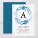 Unsere Indigo Blätter Hochzeitseinladung zeigt Ihnen Ihr Monogramm, umgeben von einem Kranz mit Aquarellblättern in lebhaften indigofarbenen und aquamarinen Blautönen mit Ihren Hochzeitsdetails unten. Die stilvollen botanischen Hochzeitsfeiern sind ideal für Frühjahr- und Sommerhochzeiten.