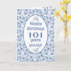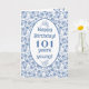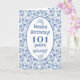 Eine sehr hübsche 101. Geburtstags-Karte, mit einem Indigo-Blaublumenmuster auf der vorderen Abdeckung und einer Imitat-Spitzeordnung auf dem Innere, in dem Sie die Mitteilung auch personifizieren können. Dieser Entwurf ist ein Teil der vornehmen und Painterly "Indigo" Sammlung und kann leicht justiert werden, um irgendwie in Scheckkartengröße zu passen.