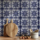 Schöne indigoblaue und weiße mediterrane Fliesen, die von portugiesischen Azulejo-Mustern inspiriert sind und eine originelle Illustration von eleganten Blume und Naturmotiven enthalten. Mit seinem modernen und dennoch klassischen Design und den aufwändigen Details sind diese Fliesen perfekt als Küchenbacksplash oder Akzent Wände in einem Speisesaal. Mit diesen atemberaubenden Fliesen verbinden Sie Tradition mühelos mit zeitgenössischem Flair und schaffen so einen stilvollen und einladenden Wohnraum.