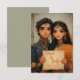 Darstellung einer indischen Braut und eines Bräutigams, die weißes Papier in ihren Händen halten und traditionelle Kleidung tragen. Die Frau hat lange schwarze Haare mit braunen Augen, während der Mann gut aussieht mit kurzem dunklem Haar und Haselaugen. Beide haben einen aufwändigen Schmuck auf ihren Köpfen und tragen orangefarbene Stickereien.