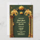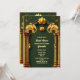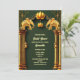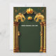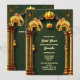 Wunderschöne goldene Lotus-Blume erscheinen in der Mitte am oberen Rand und werden von zwei Imitaten goldenen indischen Elefanten flankiert. Die Elefanten sind auf opulenten goldenen Säulen stehend, auf denen zwei kleine Laternen stehen, und werden von zarten kleinen Schnörkeln und einem bogenförmigen Set vor tiefgrünem Waldhintergrund gerahmt. Nachstehend sind die Vorlagen für den personalisierten Text aufgeführt. Die warmen, reichen Blau-, Gold-, Bordeaux- und Weißtöne verleihen dem Gesamtbild ein luxuriöses Ambiente. Die Rückseite hat das gleiche Design und zusätzliche Vorlagen für zusätzliche Informationen, die Sie gewollt können, um Ihren Gästen und Ihrer Familie zur Verfügung zu stellen. Wenn diese Vorlage nicht erforderlich ist, löschen Sie einfach den Text. Dieses elegante, königliche und königliche Design eignet sich ideal für alle traditionellen Hindu- oder Hindi-Brautpartys oder auch für ein ethnisch asiatisches Fest.