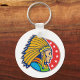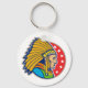 Ein wunderschönes Design eines amerikanischen Ureinwohners Chef. Dieses Design zeigt nur den Kopf in vollem indianischen Haupt-Kopfbedeckung und sieht wirklich cool aus. Der Häuptling ist Set auf einem roten Hintergrund, der einige Starts hat. Ein großartiges Design eines indianischen Häuptlings, das auf diesem Schlüsselanhänger großartig aussieht. Perfekt für sich selbst oder als Geschenk