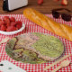 Dies ist eine Vintage Bildkarte von Oklahoma Indian Territory mit großartiger Grafik und einer Büffeljagd in Grüntönen, Rosa und Braun. Holen Sie sich die passenden Papierservietten für ein einzigartiges Thema!