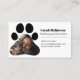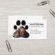 Eine minimalistische und moderne Visitenkartenvorlage für einen beruflichen Heimtiersitzer. Auf der Vorderseite der Karte befindet sich ein großer, auffallender schwarzer Pfotendruck, der elegant ein individualisierbares Foto umrahmt und so die Verbindung mit Tieren deutlich macht. Das saubere Layout enthält Platz für Namen, Titel und Kontaktinformationen. Die Rückseite der Karte bietet eine einfache, übersichtliche Liste von Serviceleistungen, die es den Kunden leicht macht, genau zu verstehen, was sie anbieten. Dieses Design ist perfekt für jeden in der Heimtierpflege-Industrie, von Hundeschuhwanderern und Heimtierern bis hin zu Tierzüchtern.