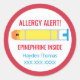 Maßgeschneiderte Allergie Warnhinweise Epinephrine Inside Kids Stickers. Personalisieren Sie auf Wunsch mit Namen oder anderem Text. Befestigen Sie Rucksäcke, Lunchboxen oder Medizinbeutel, um zu warnen, dass sich Epinephrin in der Tasche befindet. Großes Bild von gelben Epinephrin-Gerät in weißem Kreis in rot umrissen. Text liest ALLERGY ALERT! EPINEPHRINE INSIDE. Personalisiert mit Namen und Kontaktinformationen in blau. Entwürfe von Lil Allergy Advocates www.lilallergyadvocates.com