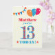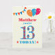 Eine farbenfrohe Geburtstagskarte für einen 13-Jährigen, der Sie mit einem Namen anpassen kann. Die große Zahl 13 ist mit einem orangen, roten und blauen Muster gefüllt, das in hellblau dargestellt ist. Oben sind Ballons und Bollen in passenden Farben, und der Gruß auf der Titelseite lautet: "(Name hier), du bist heute 13!" in hellroten und blauen Buchstaben, auf einem sehr blassgelben und weißen Polka-Punkt-Hintergrund, mit roten und orangefarbenen Sternen auf jeder Seite des Wortes "HEUTE!". Die Insider-Nachricht kann auf Wunsch einfach angepasst oder gelöscht werden.