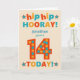 Eine helle und fröhliche Geburtstagskarte, die Sie auf der Vorderseite individuell gestalten können, mit farbenfrohen Buchstaben auf cremefarbenem Hintergrund. Die Titelgrüße ist "angesagt angesagte HOORAY! (Platz, um den Namen hinzuzufügen), du bist 14 Jahre alt TODAY!' in einem kühlen, farbenfrohen Drehbuch. Die rote Nummer 14 ist extra groß und hat große Punkte in goldgelb und grünlich blau. Die Insider-Nachricht ist nur ein Vorschlag, und Sie können sie einfach ändern oder löschen, wenn Sie etwas Anderes oder gar nichts in einer Nachricht drucken möchten.