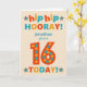 Eine helle und fröhliche Geburtstagskarte, die Sie auf der Vorderseite individuell gestalten können, mit farbenfrohen Buchstaben auf cremefarbenem Hintergrund. Die Titelgrüße ist "angesagt angesagte HOORAY! (Platz, um den Namen hinzuzufügen), du bist 16 Jahre alt TODAY!' in einem kühlen, farbenfrohen Drehbuch. Die rote Nummer 16 ist extra groß und hat große Punkte in goldgelb und grünlich blau. Die Insider-Nachricht ist nur ein Vorschlag, und Sie können sie einfach ändern oder löschen, wenn Sie etwas Anderes oder gar nichts in einer Nachricht drucken möchten.