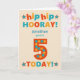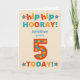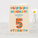 Eine helle und fröhliche Geburtstagskarte, die Sie auf der Vorderseite individuell gestalten können, mit farbenfrohen Buchstaben auf cremefarbenem Hintergrund. Die Titelgrüße ist "angesagt angesagte HOORAY! (Platz, um den Namen hinzuzufügen), du bist 5 Jahre alt TODAY!' in einem kühlen, farbenfrohen Drehbuch. Die rote Nummer 5 ist extra groß und hat große Punkte in goldgelb und grünlich blau. Die Insider-Nachricht ist nur ein Vorschlag, und Sie können sie einfach ändern oder löschen, wenn Sie etwas Anderes oder gar nichts in einer Nachricht drucken möchten.