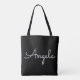 Diese Tote-Tasche hat einen stilistischen schwarzen Hintergrund und einen individuelle Name in weißer Farbe mit einem klaren Schriftart. Sie können das Design anpassen, um das, was Sie gewollt haben, zu ändern, indem Sie auf " Anpassen "-Taste klicken. Vergessen Sie nicht, die Kollektion für ein passendes Objekt zu Karo. Vielen Dank.