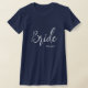 Der weibliche T - Shirt wird in einem Crew-Hals und kurzen Ärmeln Stil in Marine mit weißem Text gezeigt: Braut und ein benutzerdefinierter Beispielname. Passen Sie diesen Artikel an und ändern Sie den Beispielnamen in Ihren Namen oder kaufen Sie, wie es ist.