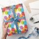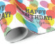 Schlagen Sie diese Geburtstagsgeschenke in einem individuellen Geschenkpapier mit einem Muster aus hellen, regenbogenfarbenen, Geburtstagsballons und leicht zu personalisierenden Geburtstagsgrüßen und individuelle Name-Texten.