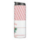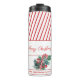 Frohe Weihnachts-Thermaltumbler in moderner Kalligraphie mit Zuckerrohr & Wintergrün und rot gestreiftem Hintergrund. Personalisieren Sie Ihre Daten mit Ihrem Familiennamen. Passende Artikel in unserem Geschäft.