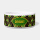 Gold und grünes Retro Art Deco nahtloses Muster auf einem schwarzen Hintergrund mit einem individuellen Namen für Ihren Baby Hund.