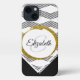 Dieses auffällige schwarz-weiße Zag Design Sets von oben auf dieser Geschenkidee Handy-Abdeckung mit einem goldenen Imitat Oval mit Namen und Anfangsbuchstaben monogramm Vorlagentext über einem schwarzen Boden. Füllen Sie das Vorlagenfeld aus, entfernen Sie eines der Textelemente, oder bearbeiten Sie mit dem Entwurfstool, um einen Schriftart auszuwählen, den Stil, die Größe und die Farbe, die Sie möchten.