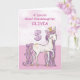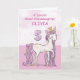 Ein süß-rosa Pony, genau wie Ihre Urenkelin, prangt mit der Nummer eins! Die goldfarbenen Details sind in ihrer Mane und ihrem Schwanz gewebt. Perfekte Karte, um Ihrer Urenkelin ihren 5. Geburtstag zu wünschen! Personalisieren Sie diese Karte mit dem Namen Ihrer Urenkelin. (Digital gerenderte goldfarbene Farbe)