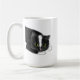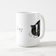 Schwarz-Weiß-Tasse. Die Tasse hat eine grüne Augenkatze, die sich hinsetzt und pinkelt. Niedliche Schwarz-Weiß-Katze-Tasse für Katzenbesitzer. Ein großartiges Geschenk für Katzenmütter oder Katzenjunges, die ein Tuxedo Kätzchen oder eine Katze haben. Fügen Sie in der Mitte der Tasse einen Namen hinzu.