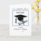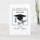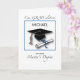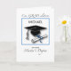 Eine Abschluss-Karte mit schwarzer Kappe und schwarzer Tassel. Ein blaues Band ist um das Diplom gebunden und ein passender blauer Rahmen um das Bild herum. Passen Sie den Namen des Master-Grad-Abschlusses für eine wirklich persönliche Karte an.