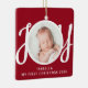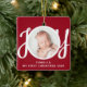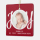 Dieses niedliche Baby's First Christmas Foto Ornament ist mit dem Wort JOY in stilvoller Schrift Typografie auf einem roten Hintergrund dekoriert. Einfach mit Foto, Name und Jahr anpassbar.