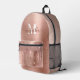 Dieses elegante personalisierte Rucksack verfügt über eine vergoldete Rose mit vergoldeter metallischer Folie, mit einem staubigen, rosafarbenen Glitzer aus Rose und einer texturierten Folie, die aus der vorderen Hosentasche tropft. Die Textfelder erlauben einen monogramm-weißen Initial zusammen mit einem kalligraphischen Skript-Schriftart in Marsala Bronze.