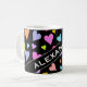Dieses fröhliche, lustige und liebevolle Design der Tasse zeichnet sich durch ein Muster von Herzformen verschiedener Größen und Farben aus. Es verfügt auch über einen individuelle Name in weißem Text in einem dunklen Bereich, mit beiden schräg. [~Z0000051]