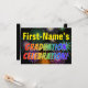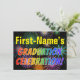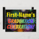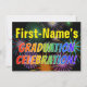 Diese vibrierenden, aufregenden Abschlussfeiereinladungs-Ausrüstungsbeschreibungen ein personalisierter Name und die Mitteilung "ABSCHLUSS-FEIER!" mit Buchstaben inspirierte Haben eines Regenbogenspektrums Steigungsmuster. Die Rückseite kennzeichnet personalisierte Informationen über das Abschlussfeierereignis. Einladungen wie diese konnten zu benutzt werden einladen Gäste zu einem Party oder zu einer Feier, die für jemand gehalten wird, das gerade von der Highschool, von der Uni, von der Universität oder von irgendeinem anderem Programm der Studie gradated.