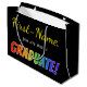 Dieses Abschlussglückwünsche giftbag Ausrüstungsbeschreibungen ein personalisierter Name und die Mitteilung "Sie sind jetzt ein ABSOLVENT!". Die Buchstaben des Wortes "GRADUIEREN!" haben Sie einen Spaß, inspiriertes Steigungsmuster des Regenbogens Spektrum. Eine Geschenktasche so könnte eine Spaßweise sein, die ein Geschenk einwickelt, das jemand gegeben wird, das vor kurzem von der Highschool, von der Uni, von der Universität oder von irgendeinem anderem Programm graduiert hat.