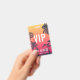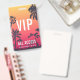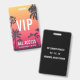 Dieses individuell gestaltbare Abzeichen ist ideal für Sommerkonzerte, Festivals und Großveranstaltungen und bietet einen Hintergrund aus Palmen-Silhouetten vor einem roten und gelben Sonnenuntergang im Sommer mit weißen Textüberlagerungen. Anpassen für VIPs, Mitarbeiter, Presse oder andere Anwendungen, mit drei Textzeilen auf der Vorderseite. Fügen Sie der Rückseite des Abzeichens zusätzliche Ereignisinformationen in weißer Schrift auf schwarz hinzu.