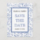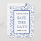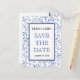 Die Save the Date Postkarte ist mit einem indigoblauen Muster mit Blätter und einem weißen Rahmen mit geschliffenem Rahmen versehen. Ideal für eine Hochzeit im Sommer.